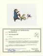 This original hand-painted cel of Brer Rabbit, Brer Fox and Brer Bear was created in the Disney ink-and-paint department during production of a limited edition set of 350 cel paintings based on the "Laughing Place" animated segment of Walt Disney's wonderful 1946 animated feature. In 1989 Disney Art Editions released a set of two limited edition cels based on the "Tar Baby" and "Laughing Place" segments of the movie; the cel paintings bore the Disney seal and were numbered. This cel painting was created at Disney at the same time over and above those issued in the official release; it is unnumbered and without seal.